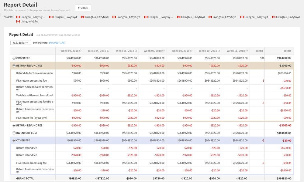 All connected amazon accounts' data is visible, and the tool gathers the data by default currency. No matter which amazon marketplace account you want to check, achieve it easily.